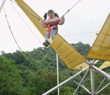 在從高高的地方落下時,家蓉的表情是露出了些恐懼,媽媽立刻說:「姊姊,有點兒可怕喔!」家蓉點點頭。「可是很好玩,對不對?」家蓉笑開了,接下來彈得再高也不害怕了。