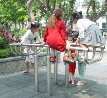 於是這天玉米看到家蓉家萱正在爬樓梯扶手外側,並且從第四格的地方往下跳,玉米就想到這個爸爸的懲罰,聽說一試就見效,於是玉米說:『來,既然你們喜歡跳,請你們跳一百次,要好好數喔!』兩個女娃一口答應,開心的開始輪流上去跳,一面開心的數。玉米心裡偷偷的想:等一下你們就知道媽媽的厲害了...。