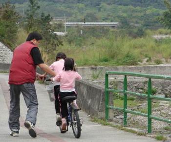 好吧,勸阻不了兩個小短腿想要自己騎協力車的念頭,有一段路就變成這樣騎,阿公跟媽媽,阿媽自己一輛,苦命的爸爸變成協力車的平衡桿。