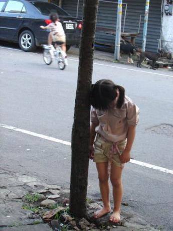 事實上,孩子正在玩耍,玉米只是要拍孩子身上穿的卡其衣,家蓉看到媽媽正在拍照,腳踏車騎著騎著,就騎遠了;家萱看到媽媽正在拍照,腳踏車騎著騎著,丟下車,站到樹旁,就這樣表演著。