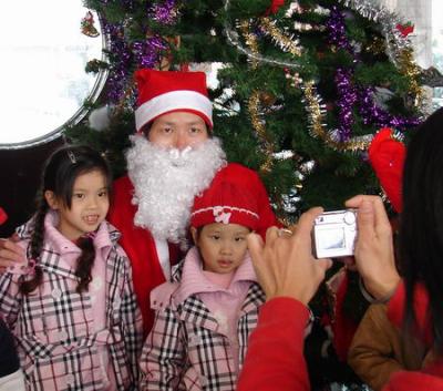 等聖誕老公公走回來,媽媽立刻把家萱抓起來遞過去給聖誕老公公,這一遞,又差一點把家萱嚇暈了!家萱一逕兒大哭,搞得聖誕老公公覺得真是沒面子極了!只好送上好大一把糖果,企圖收買。當然,這一招立刻奏效!