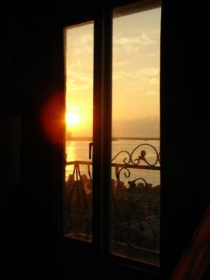 可惜我們的窗雖然面海,太陽卻在我們的十點鐘方向,我被欄杆與只能開三分之一的窗戶阻擋著,只好將相機伸出窗外拍日出,所以每張都歪歪斜斜的。可惜!