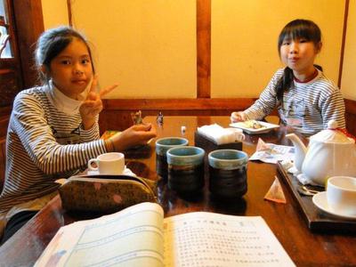 為了不想在家裡寫自修寫到我們母女劍拔弩張,為了讓寫自修變得比較可以忍受,我們移駕到友竹居去。孩子們第一次到友竹居,很新鮮,很興奮。家蓉熟悉了環境就開始動筆,家萱還得去上廁所,趁著上廁所跑去賞魚,許久許久不見人影。切~~