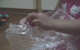 這個新玩具可樂壞了她老爸,趕緊匆匆地四處搜括了各式各樣的氣泡袋回來。有透明的,有紅色的,有小小的普通型的,有大大顆像十元硬幣一樣大的。