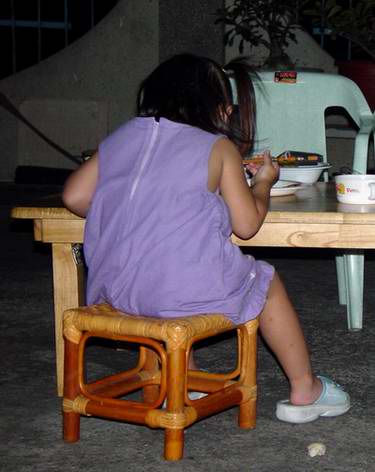 照片是烤肉時,最愛吃肉的家萱,快樂的吃不停!現在仔細看照片才發現,ㄟ,可愛的小胖,妳只拿一根筷子耶!