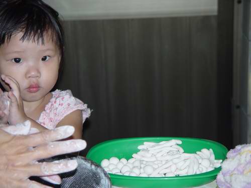 照片中的家萱正在搓湯圓,搓成一條一條的麵條,因為她好認真,我還是忍不住要鼓勵她一下,兩歲半的家萱,好棒喔!