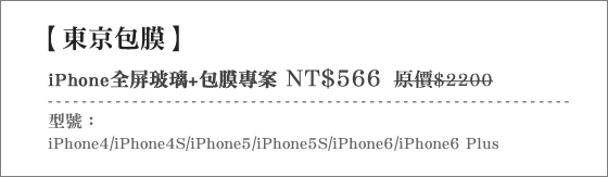 其他須知: 只要566元即可享有【東京包膜】原價2200元iPhone全屏玻璃+包膜專案:全屏玻璃+包膜型號:iPhone4/iPhone4S/iPhone5/iPhone5S/iPhone6/iPhone6 Plus(6選1)。
