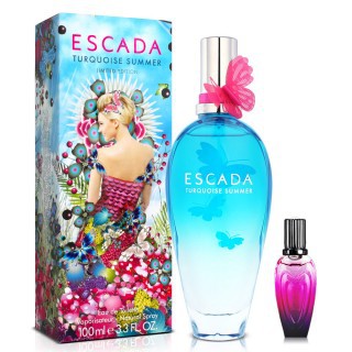 ESCADA綻藍香頌 女性淡香水的精緻包裝及經典瓶身完美展現夏日自由奔放之意,並貫徹品牌夏日限量版的風格,以獨一無二的ESCADA女孩為特點設計,往往令人驚喜不絕。半透明藍綠色的瓶身呈現,印上若隱若現的蝴蝶圖案,瓶頸更繫上栩栩如生的粉紅色蝴蝶裝飾,散發女性嬌柔嫵媚的魅力。