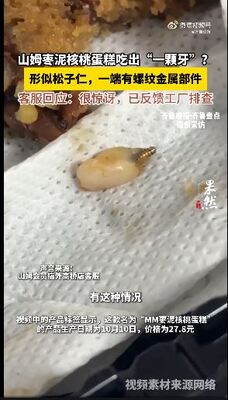 中國食安問題頻傳,近日有一名消費者在上海山姆超市(Sam's Club)購買一盒棗泥核桃糕,不料吃到一半竟跑出疑似一顆末端有金屬羅紋的假牙,讓他相當傻眼。雖然山姆超市客服人員表示,公司對食品處理人員的穿戴和衛生規定相當嚴格,強調已返饋給工廠排查,仍讓廣大中國網友不滿,認為食品安全「令人擔憂」。