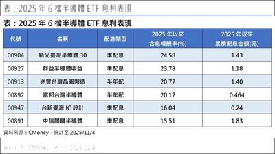 2025年6檔半導體ETF息利表現 。(圖/CMoney)美科技巨頭競逐AI強權,推動2026年半導體進入「產能擴張」、「技術革新」雙週期齊頭並進,帶動台股半導體明年成長榮景佳,半導體ETF多頭息利雙收表現有望續航。根據CMoney統計至11/4止,2025年半導體ETF息利表現各有所長,績效方面,新光臺灣半導體30(00904)今年以來累積含息報酬率達24.58%,在同類型ETF績效表現最佳;配息方面,中信關鍵半導體(00891)年初迄今每單位累積配發金額共1.83元,為同類型累積配息金額最多。