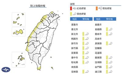 氣象署發布15縣市陸上強風特報。(圖/中央氣象署)中央氣象署發布陸上強風特報,東北風偏強,今(8)日晨至9日晚上蘭嶼、綠島、新北市、桃園市、新竹市、新竹縣、苗栗縣、臺中市、彰化縣、雲林縣、嘉義縣、臺南市、屏東縣、澎湖縣、金門縣、連江縣局部地區有平均風6級以上或陣風8級以上發生的機率(黃色燈號),請注意。