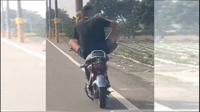 彰化外籍移工盤腿騎車吃泡麵,全程以雙腿控制龍頭,宛如特技表演。(圖/翻攝自黑色豪門企業)透過畫面可以看到,民眾開車行經150縣道彰化路段,前方一名穿黑衣的外籍移工以盤腿姿勢騎乘電動車,仔細看他的右手還拿著一雙筷子,詭異畫面引起民眾注意,加速上前查看,這才發現這名移工竟邊騎車邊吃泡麵,還低頭看手機,全程僅以雙腿控制龍頭,誇張舉動堪比特技表演。