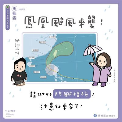 鳳凰颱風來勢洶洶!台北市今(11)天正常上班課,投入台北市中正萬華議員選戰的媒體人馬郁雯貼出一張圖提醒民眾要做好防颱準備,有趣的是,這張圖中,政論主持人、男友李正皓身穿兩顆愛心的衣服,在一旁跪算盤,馬郁雯說,這是因為祈求風調雨順的力道必須加大。