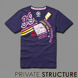 (愛美必備)穿搭介紹 【PRIVATE STRUCTURE】復古揚聲機圖騰V領短袖(海藍色)