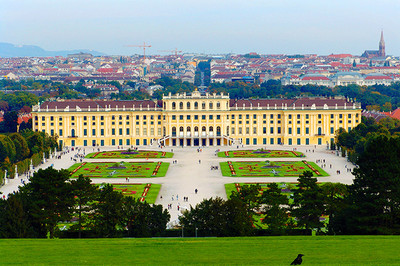 照片:晴空下,整列的花壇與散發著淡黃色「美泉黃」的美泉宮,東北方還依稀可見矗立市區內的史帝芬教堂(Stepha...