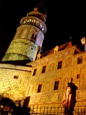 照片:寧靜黑夜下巍峨聳立的城堡與彩繪塔 / 攝於捷克.庫倫洛夫 照片:夜晚的小城原是個巨大的露天布幕,隨處皆...