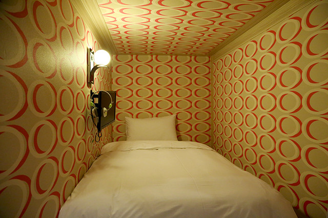 照片:「快活背包客」獨立的箱型床位空間,四周暖色系壁紙看了讓人心情感到和緩