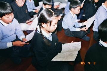 照片圖說:攻站時間,孩子們專心地唱頌經文。