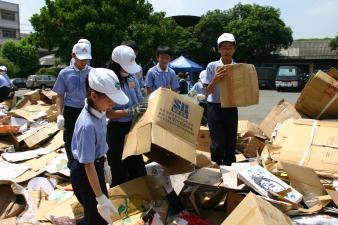 在場的謝依靜小菩薩聽得認真而入神、太陽底下做得更是滿臉通紅,問她今天歡不歡喜?她說:“很高興,因為媽媽平常在家也有在做分類,所以今天做起來很得心應手!”依靜雖然只是國小五年級的學生而已,但說起話來有條不紊,態度更是親和有禮,我想那應該也是她的母親給了她很好的身教示範所成!