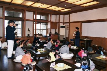 步入靜思茶道教室,傳來陣陣悠揚音樂聲,靜端師姊說:茶跟人的生活太接近,太生活化了,因此人人都會喝茶,但多數人都沒有感覺,從品茶過程中學習如何應對進退。師姊示範泡茶流程及學習規矩與奉茶,並仔細的叮聆小朋友們泡茶中種種規矩,泡茶人應將口杯文字、圖案美的一面向客人及倒茶時茶海口朝向自己,是一種尊重客人禮儀。