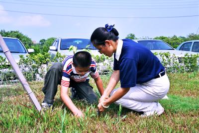 雲榕媽媽帶領著一群小小志工們來到分會大門的西側花園,小草遍佈滿地。雲榕媽媽蹲在地上告訴孩子說:「鏟子要用力往雜草的根部土裡挖,才能將雜草拔除。來!媽媽示範給你看。對!就是這個樣子...」