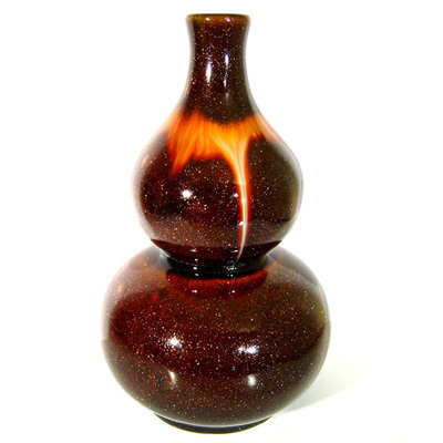 ☆以高量的鐵成份在1230’c的高溫與燒成氣氛控制下得到無數微小金屬氧化鐵晶體,這些晶體不是在釉的表面生成,而是懸浮在釉層中, 因此當光線照射時,能反射閃耀奪目的光芒,與自然界的砂金極為相似,所以稱之為"灑金釉"