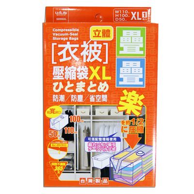 <疊疊樂>立體 衣被壓縮袋 XL(三入) = 防塵、防潮、省空間 = 是否家中已買了不少收納箱,每每到換季時總還覺得衣服放不下就是放不下;又大又佔空間的收納箱,再買家中的生活空間就越來越少且不用時收不起來超級不實用又浪費空間~NO! 別煩腦讓我推薦”疊疊樂系列[衣被]壓縮袋”給你!這一系列[衣被]壓縮袋有立體的、扁平的及旅行專用等多種不同功能的產品,能有效增加1/2~2/3的使用空間,同時具備防塵防蟲防潮防變色的功能,除臭襪,只要用吸塵器或用手壓就可輕鬆壓縮,不論是收棉被收衣物,不論是居家或外出用,均能替你有效省下不少空間~贊!