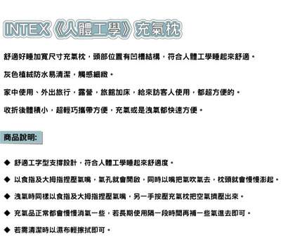 前幾天在逛街的時候看到【INTEX】人體工學充氣枕(68677) 覺得很心動而且正打算買【INTEX】人體工學充氣枕(68677)