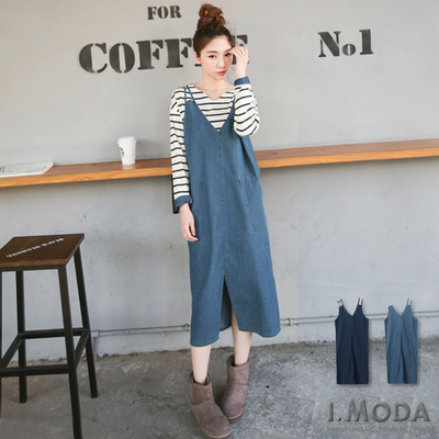 1205新品 清新愉悅~大V領仿牛仔雙肩帶雙口袋開岔下襬洋裝.2色 )