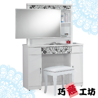 【巧意工坊】卡碧雅3.2尺白色收納鏡台(含椅),整組白色與3mm玻璃藝術印花飾板搭配,純白與印花飾板亮麗的搭配下,展現單純而不單調的優雅風貌,展現您獨特的品味及性格,搶眼設計突顯您非凡的好品味,簡單擺放即可點亮居家感受。整體採用高級防蛀木心板+全包式MDF,堅固耐用結構紮實,防蛀的材質讓您不用擔心蟲蟲危機,使用安心沒煩惱。鏡片左右移動隱藏式收納,讓您可以把保養品瓶瓶罐罐簡單收納,整齊又不凌亂。抽屜多格收納,超大容量置物空間,讓您可以便利整理收納任何物品,輕鬆好整理。大空間四抽屜設計,讓您收納衣物、配件輕鬆便利,臥室空間變得整齊不凌亂。鏡台貼心含椅,美觀設計一整套,讓您省去搭配的煩惱,好坐又耐重耐用,使用更安心。釘附式美背處理,精細工法讓背板穩固不搖晃,美觀又耐用。鋼珠滑軌結構,讓抽屜滑順又好拉,輕鬆不費力。超耐磨紙處理,耐磨表面亮麗,除了具有防潮功能外,讓原始的色澤更亮麗,觸感十分滑順。想要輕鬆妝點您的臥室嗎?就讓【巧意工坊】卡碧雅3.2尺白色收納鏡台(含椅)用簡約設計,帶您盡情享受輕鬆優雅生活的魅力吧!