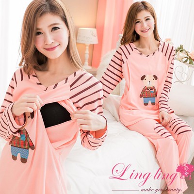 【lingling日系】PA2073全尺碼-側開口小熊格子條紋袖哺乳孕婦裝居家長袖二件式睡衣組(亮橘粉)