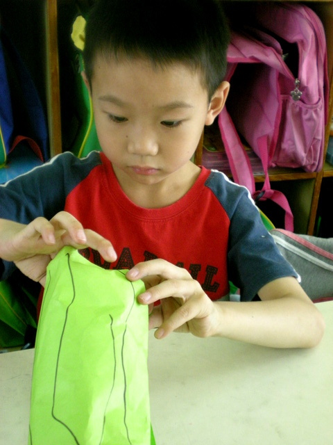 針對上回大家討論分組的創作孩子們也迫不及待的動工啦~ 葫蘆的孩子們細心的為小葫蘆包裝上綠色外衣