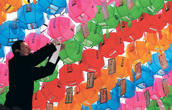 雖然距“浴佛節”(5月15日)還有一個多月,但各寺廟已經在忙著準備釋迦牟尼誕辰紀念活動。12日,在首爾鍾路區堅志洞曹溪寺,職員懷著對佛祖的虔誠在挂蓮燈。 부처님 오신 날(5월 15일)은 아직...