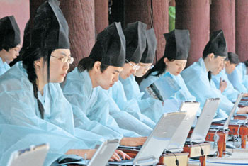 12日下午,在首爾鍾路區成均館大學明倫洞舉行了朝鮮時代科舉“謁聖試”重現活動。圖爲,參加科舉的考生們穿著道袍,頭戴儒巾,正利用“現代式文房用具”筆記本電腦答題。