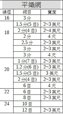 經紗(圓絲)與緯紗(扁絲)上下交織而成,一般市面上使用,以平織網居多