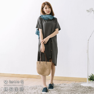 【-KatieQ 慢。生活】推薦 斜邊假釦棉麻連身裙-F(灰-卡-桔)站長評比