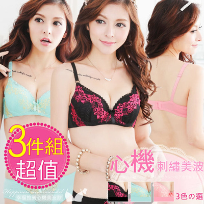 【曼格爾】時尚內衣 心機美波細緻刺繡花樣爆乳內衣3件組 B罩32-38(性感黑+輕粉綠+輕甜粉)該商品熱烈促銷中,為避免買不到,入手要快!