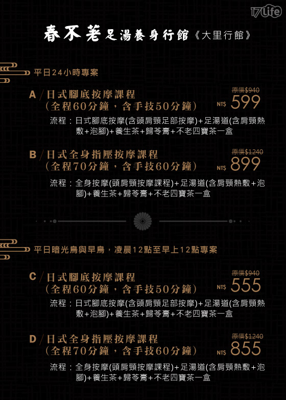 商品訊息特點只要555元起即可享有【春不荖足湯養身行館《大里行館》】原價最高1,240元日式腳底按摩/全身指壓按摩課程:平日24小時專案/平日暗光鳥與早鳥凌晨12點至早上12點專案。