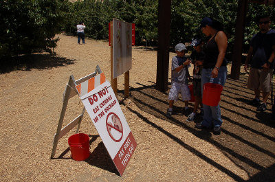 今年部分農場掛起招牌:「請勿在果園內試吃」,且園內進駐員工巡邏,避免遊客破壞櫻桃樹、或免費試吃占業主便宜。