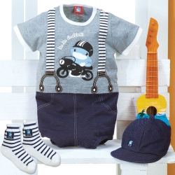 勁率牛仔連身吊帶裝禮盒三件組(灰),安全壓扣設計方便穿脫,100%純棉材質不傷寶寶肌膚,搭配俏皮的假吊帶造型設計,禮盒三件式組合,搭配同系列寶寶帽+寶寶襪,小寶貝穿上舒適又率氣活潑!!
