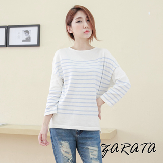 【ZARATA】圓領海軍條紋短版針織上衣(藍色)