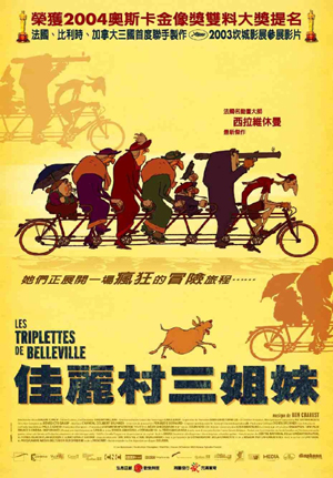 【佳麗村三姊妹】(The Triplets of Belleville)是由法國、比利時、加拿大三國首度聯手製作的精緻動畫,不但票房橫掃歐美各國,也奪下了各大影展史無前例的超級獎項。許多影展將「最佳動畫片」理所當然地頒給了它,而有些美國影展和電影協會更直接頒給它「最佳外語片」。如果說【海底總動員】是美國近年在世界影壇票房和影評雙贏的動畫代表作。那麼,入圍法國凱薩獎及英國影藝學院獎,並榮獲紐約、洛杉磯兩大影評人協會「最佳動畫」殊榮,且又與【海底總動員】一起入圍本屆奧斯卡最佳動畫片的【佳麗村三姊妹】絕對是跨足歐美、全世界近年來最重要的一支動畫片。