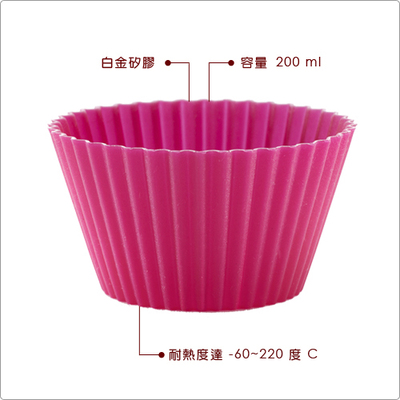 本商品一組 6 烤杯入、單杯容量 200ml(共三色);耐熱度 -60~220 度C (請遠離直接火源),適用微波爐、烤箱、冰箱、洗碗機。悠閒的下午就來做點心吧,看著熱騰騰的點心、蛋糕,巧克力等出爐,心情都好起來了。獨立蛋糕小烤杯可一次烘培多個瑪芬蛋糕,再加入蘋果、藍莓、椰子等不同乾果,輕鬆享受美好的午茶時光。好脫模的矽膠材質,讓您烤後方便快速享用,絕不沾黏破壞形狀(幕斯類請成型後再脫模)。全系列由高密度且品質穩定的白金矽膠製成(BPA Free);請勿在白金矽膠上使用尖銳器具,如刀叉等。