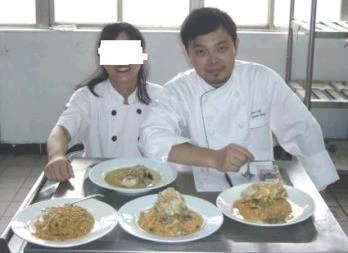 這是我和我的好朋友Darren(為平)難得的合照,我們準備吃這些樣品菜,真噁! 這張照片當時因為某些因素,所以逸蝶把自己"抹白"! 因為當時逸蝶還是廚師,所以穿著廚師服. 而廚師的階級區分,是看鈕扣...