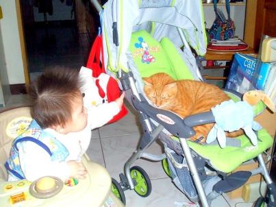 Baby:快來人啊!熊熊坐我的娃娃車啦! Baby:Baby:怎麼會這樣呢? Baby:嗯!好吧!讓牠!誰叫牠是熊熊叔叔,輩分比我大! 熊熊:娃娃車真好睡! 小米路過:噁心死了,七老八十的老貓還睡娃...