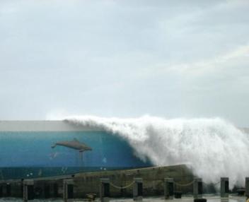 因為海棠颱風來襲,大浪翻越鋪設各式魚類造型浮雕馬賽克的港區防波堤胸牆,傾瀉入內港,非常壯觀! ============================== 台東伽藍(富岡)漁港 伽藍(...