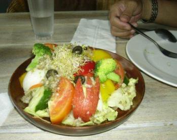 海邊綠色公園的美麗希臘式咖啡屋之三,好吃的蔬果沙拉,有人很饞,拿著叉子想要吃,可是,還沒拍照不準吃!嘿嘿! ※附圖為希臘式咖啡屋的蔬果沙拉,逸蝶攝於2005/7/17。