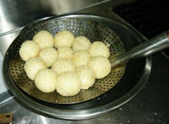 將糯米粉和糖水充分揉勻,分成小塊,包裹預先揉成球狀的紅豆沙,沾水,再沾生白芝麻,下鍋,中低溫油炸。 注意,沾好白芝麻之後,還要揉一下,以免芝麻易掉落。 ※附圖為下鍋油炸之糯米球,逸蝶攝於2005/...