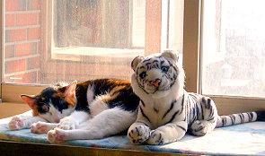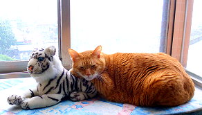 春日午后,逃跑貓和小虎玩偶一起在窗台享受陽光。外祖父乖乖也加入了。媽咪Noli也來湊熱鬧。