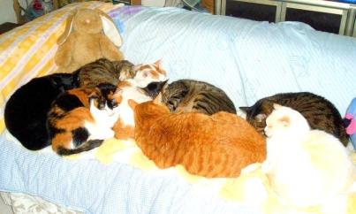 天冷,八隻貓咪一起取暖,第九隻呢?小米在哪裡?小米在我的正前方電腦螢幕上睡覺,因為牠沒有朋友!不跟其他...